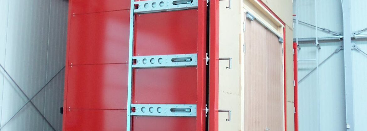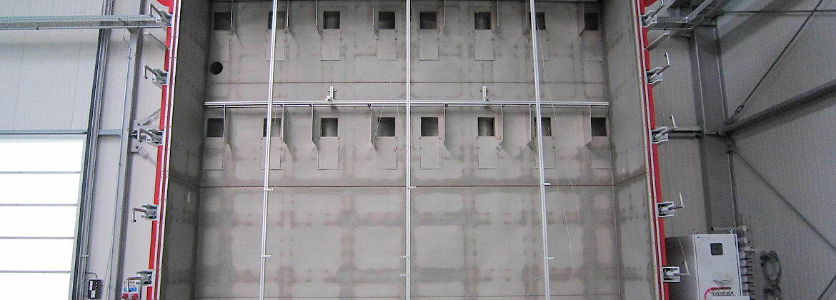 A smoke control test chamber in Lathen allows to test the leakage rate of smoke barriers (doors, gates, flaps, windows) with maximum dimensions up to 5.00 m x 5.00 m according to